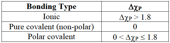 - Ionic and covalent bonding are two extremes as many substances show intermediate character. The nature of the bonding can be related to bond polarity and the difference in electronegativity values $\rm (\Delta\chi_P)$ of the bonded atoms.