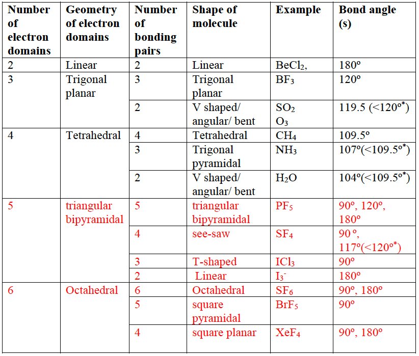 $\rm PCl_5, SF_6$: $\rm P$ and S are both in third period and have $\rm 3d$ orbitals in the valence energy level are available for bonding and so can have more than a stable octet. - $\bf VSEPR$ theory: the total number of electron domains determines their geometrical arrangement as they mutually repel; the shape of the molecule depends on the number of bonding pairs within this arrangement.