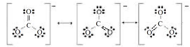 The carbonate ion. The bond order of the carbon-oxygen bond is $4/3$ and the charge on each $\rm O$ atom is $-2/3$.