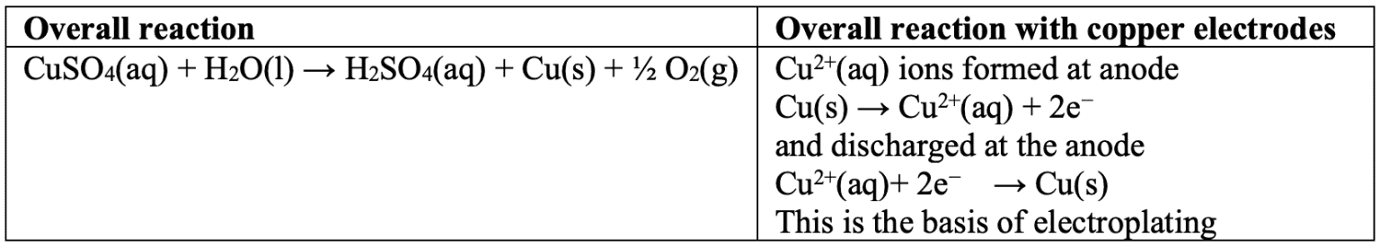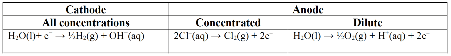 $\rm H_2O(l)+ e^− \rightarrow ½H_2(g) + OH^−(aq)$ $\rm E^{\theta} = −0.83~V$. - The products of electrolysis in aqueous solution depend on: