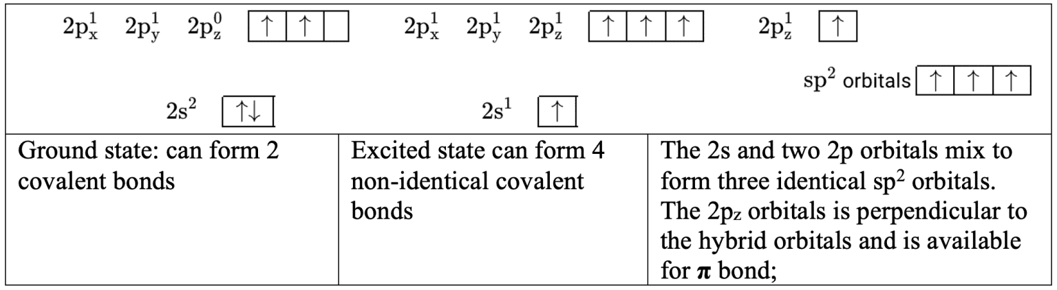 - To form $3\sigma$ bonds in ethane, $\rm C_2H_4$; the $\rm 2$s and two $\rm 2p$ orbitals mix so that an electron is available for σ bonding in three identical $\rm sp^2$ hybrid orbitals. This leaves an electron in a $\rm 2p$ orbital which is available to form a $\pi$ bond.