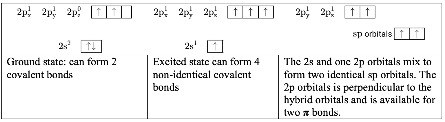 - To form $2\sigma$ bonds in ethyne, $\rm C_2H_2$, the $\rm 2s$ and one $\rm 2p$ orbitals mix so that an electron is available for $\sigma$ bonding in two identical sp hybrid orbitals. This leaves two electrons in two $\rm 2p$ orbitals which are available to form two $\pi$ bonds.