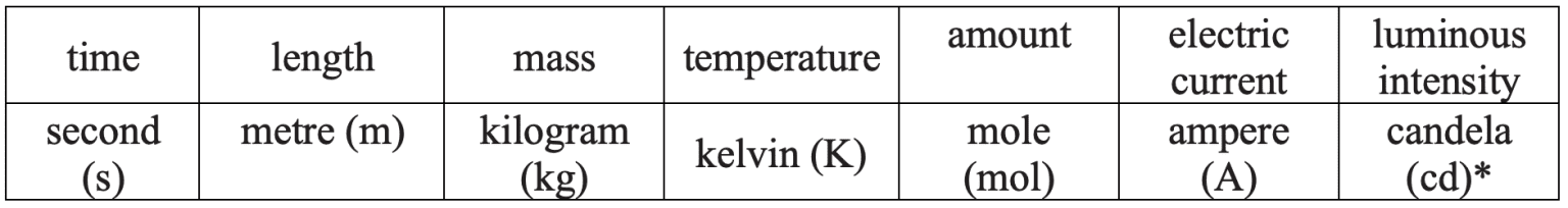 - All other quantities have derived units, i.e., combinations of the fundamental units. $\rm E.g.$, The derived unit the newton is $\rm kg~m~s^{-2}$ (using $\rm F = ma$).