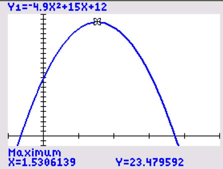 Explanation: Using the graphing calculator and the 2nd Trace function option 4: maximum gives a maximum height of $23.5$ meters.