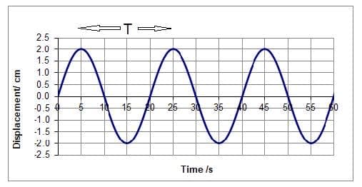 In this example $\rm T = 20~s$ and the amplitude $\rm = 2.0~cm$. - The frequency $(f)$ of an oscillation is the number of cycles per second. $f= 1/\rm T$