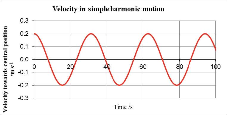 - The velocity can be determined from the slope of the displacement-time graph. In this example it is a maximum at $t = 0$ and so follows a cosine curve.