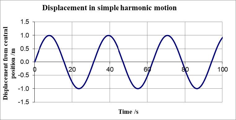 As $\mathrm T = 1/f =2\pi/\omega$. This gives $\omega = 2\pi f$ - The displacement can be described by a sin or cos curve depending on the initial displacement.