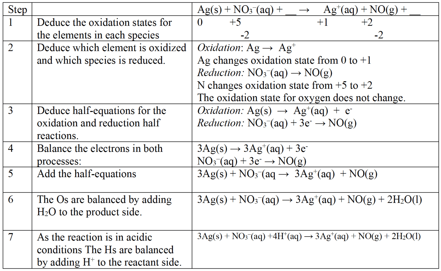 $\rm Ag(s) + NO^–_3(aq) + \underline{\quad}$ $\rm \rightarrow Ag^+(aq) + NO(g) + \underline{\quad}$