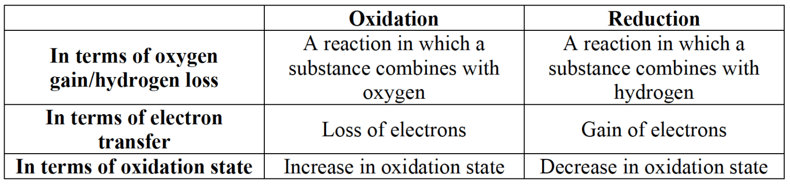 - Oxidation and reduction can be defined in terms of oxygen, hydrogen and electrons loss or gain, or change in oxidation state: