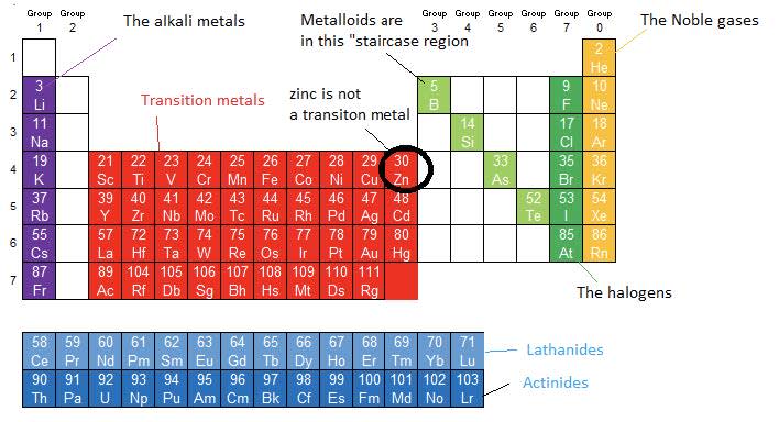 - The transition metals are in a large rectangular section - the $\rm d$-block elements in the middle of the Periodic Table. They are elements with an incomplete $\rm d$-sublevel or form ions with an incomplete $\rm d$-sublevel. Although in the $\rm d$-block zinc is not considered a transition element as it has a full $\rm 3d$ sublevel, with a condensed electron configuration $\rm [Ar]3d^{10}4s^2$.