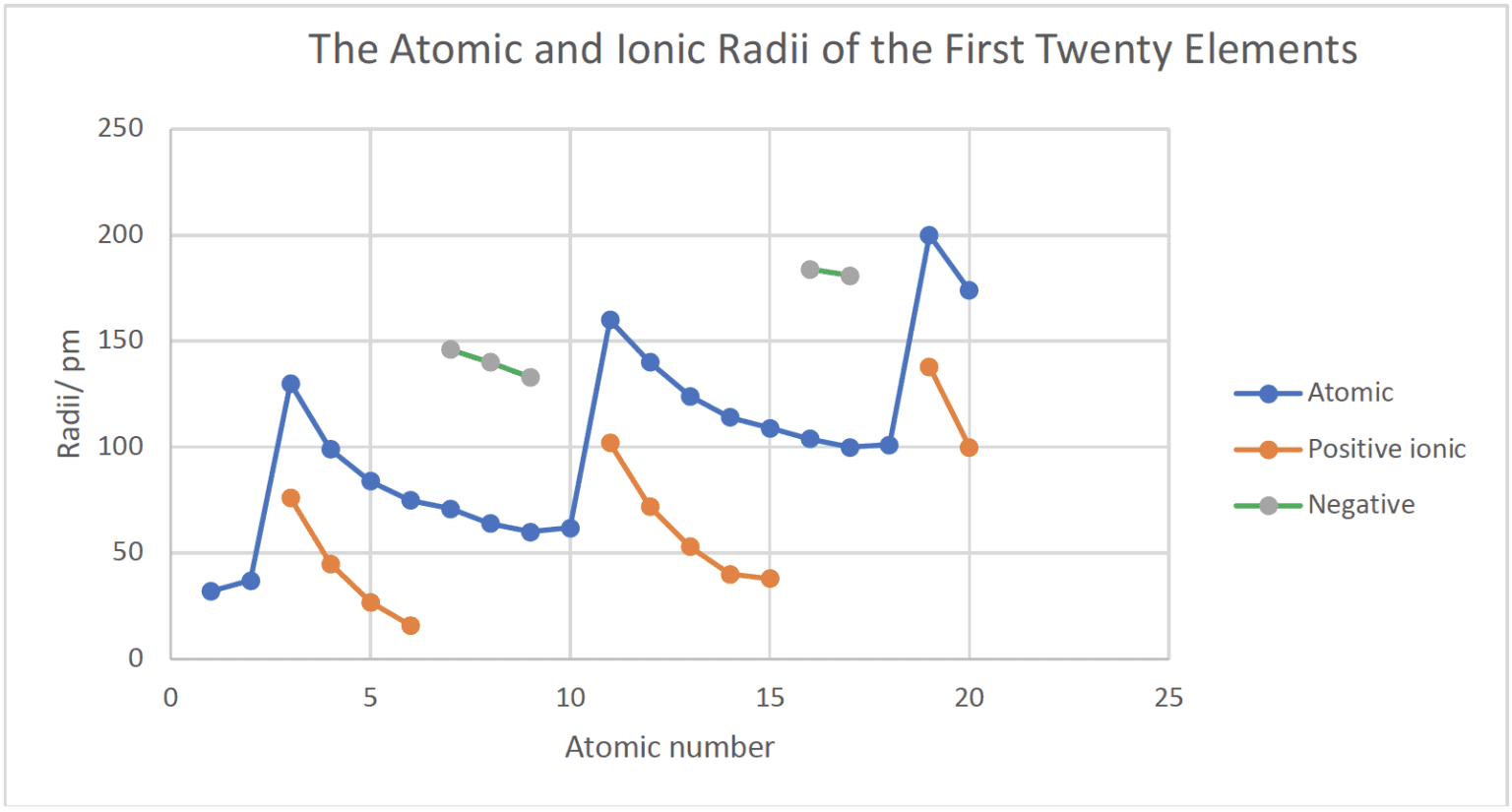 • The ionic radii decrease from Groups $1$ to $4$ for the positive ions. The ions $\rm Na^+$, $\rm Mg^{2+}$, $\rm Al^{3+}$ and $\rm Si^{4+}$ are isoelectronic and have the same electron configuration $\rm 1s^22s^22p^6$. The decrease in ionic radius is due to the increase in nuclear charge with atomic number across the period. This increases the electrostatic attraction between the nucleus and the outer electrons.