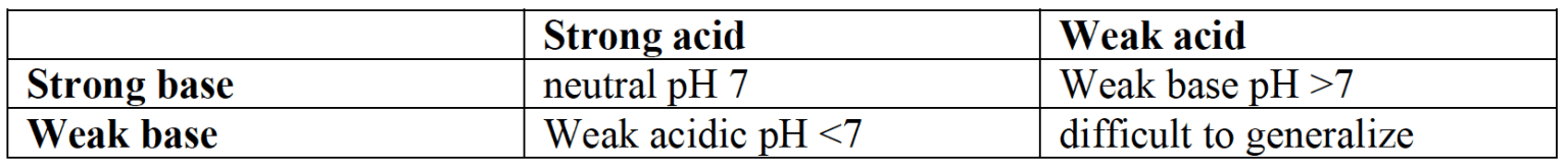 - The equivalence point occurs when equal stoichiometrically amounts of acid and base have reacted together, so the solution contains a salt and water only. The $\rm pH$ of the salt formed depends on the relative strength of acid and base that reacted together as shown in the table.