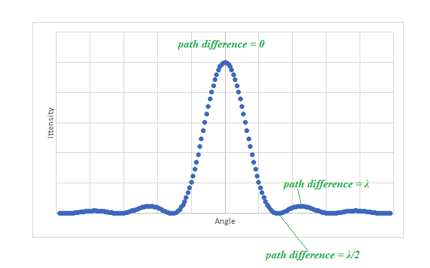 - If this path difference is half a wavelength there is destructive interference and there is a minimum at a diffraction angle $\theta: \theta=\lambda$