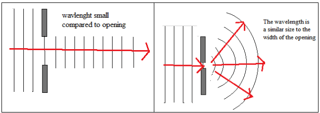 - Diffraction is the spreading of a wave as it goes through an opening or passes an obstacle. Diffraction is a property that characterises wave behaviour.