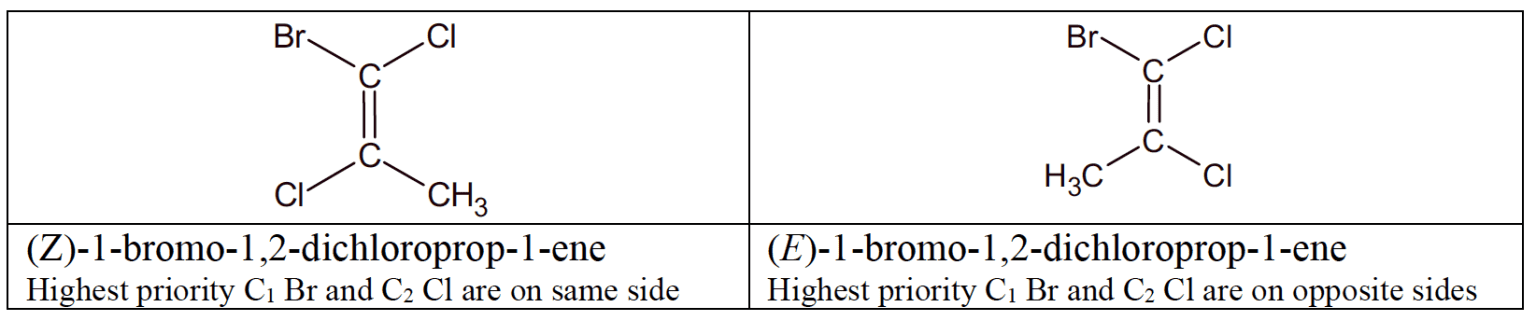 - Each group attached to each $\rm C$ atom of the ring or double bond is assigned a priority based on atomic number. The $\rm E$ isomer has the two groups of highest priority on the same side of the double bond or ring, and the $\rm Z$ group has them on the opposite sides.