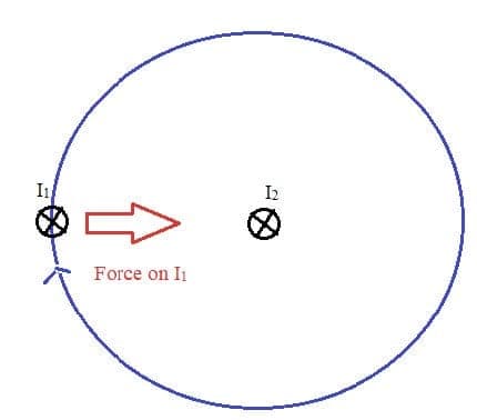 - If the current is in the same direction in two parallel wires, there is a force of attraction. Currents that flow together go together.