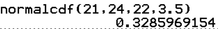 Thus, the probability is $0.329$. There is a $32.9\%$ chance that a randomly selected student scored between $21$ and $24$ points inclusively.