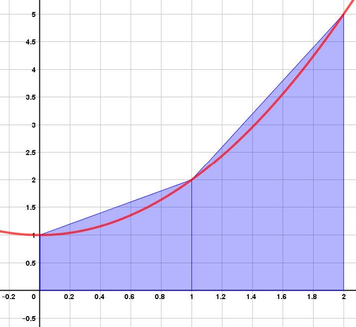 Example 1: Approximate the area under the curve of $f(x)=x^2+1$ and above the $x-$axis for $0\leq x \leq 2$ by calculating the areas of $2$ successive trapezoids.