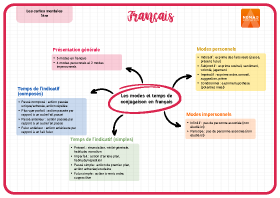 Si on observe un tableau de conjugaison, on peut voir qu'il se découpe en 6 cadres correspondant aux 6 modes en français : indicatif, subjonctif, impératif, conditionnel, infinitif et participe.